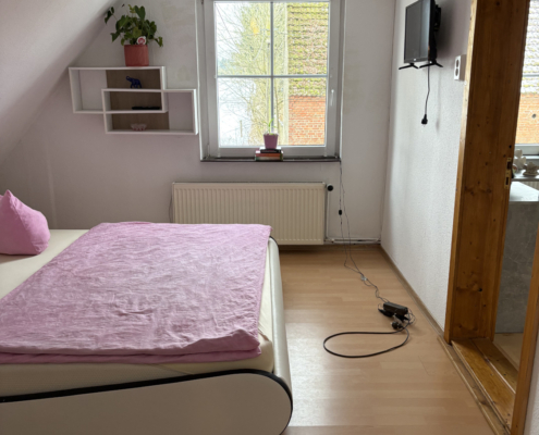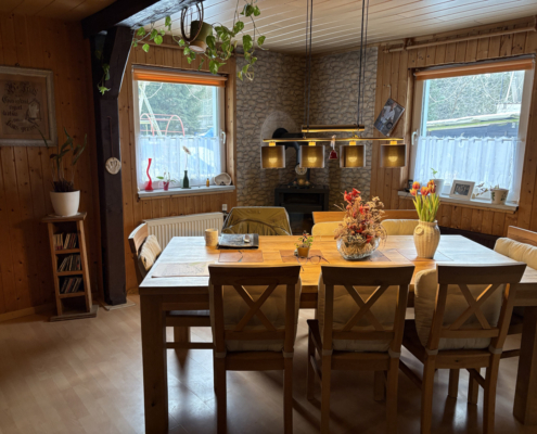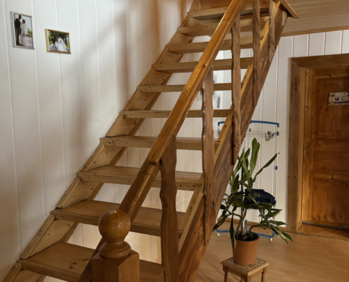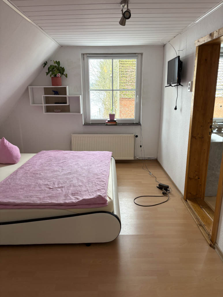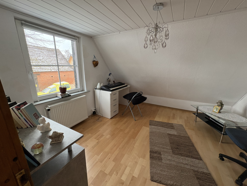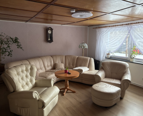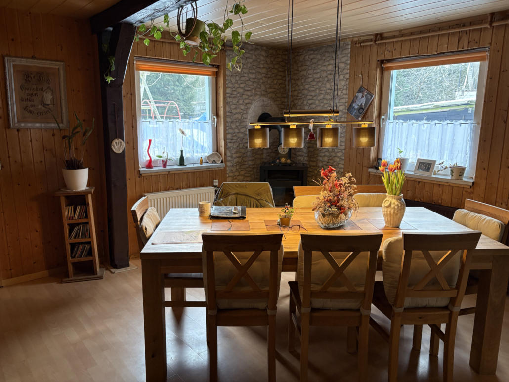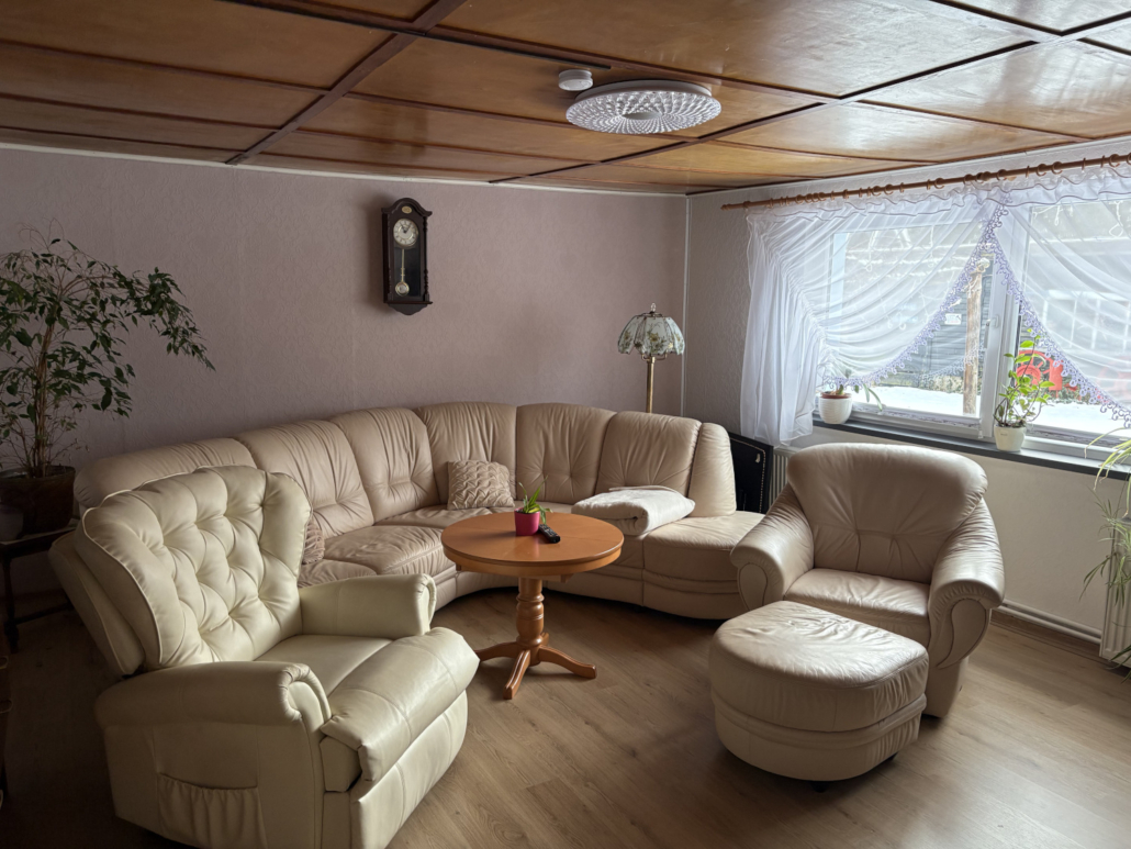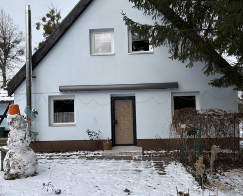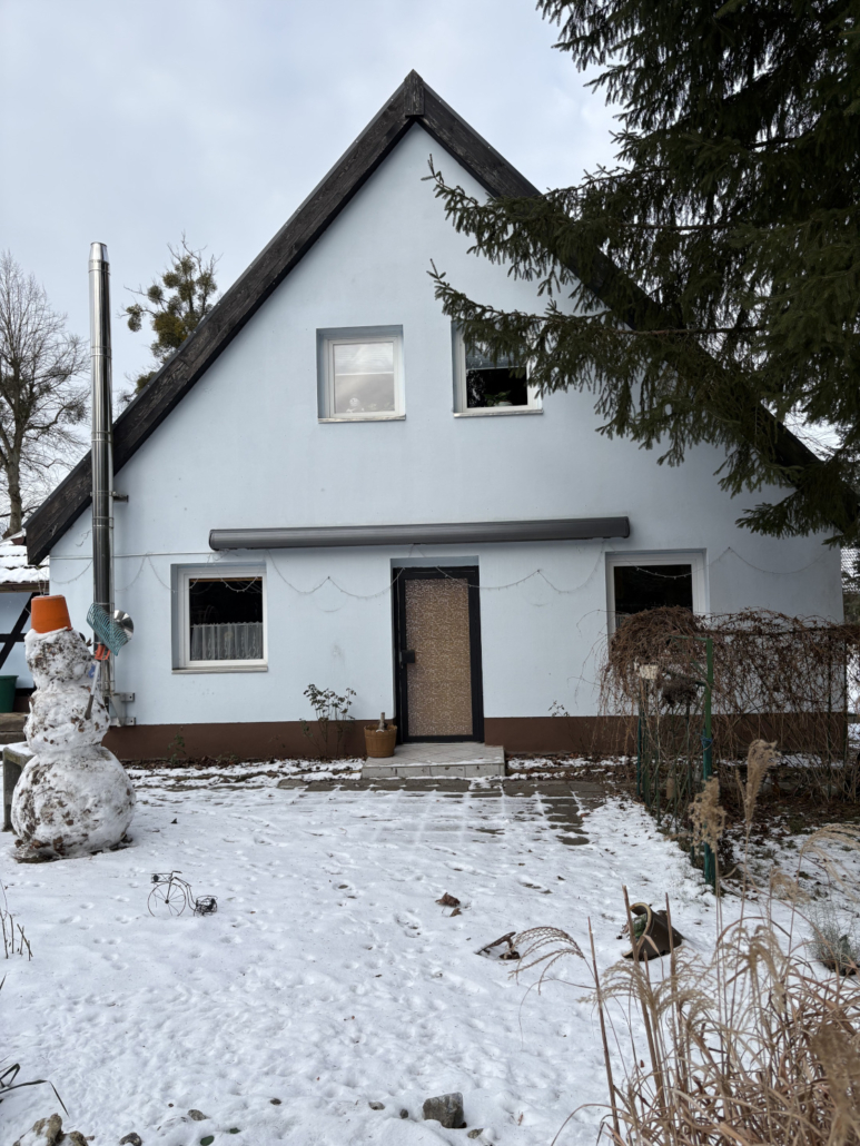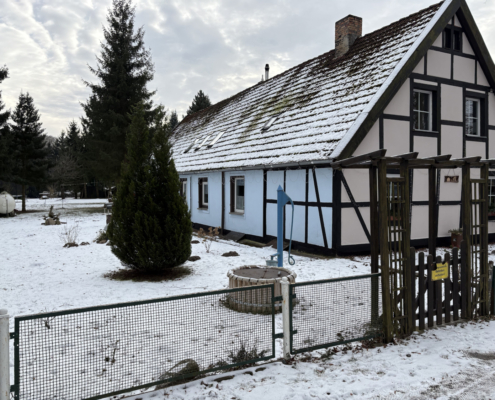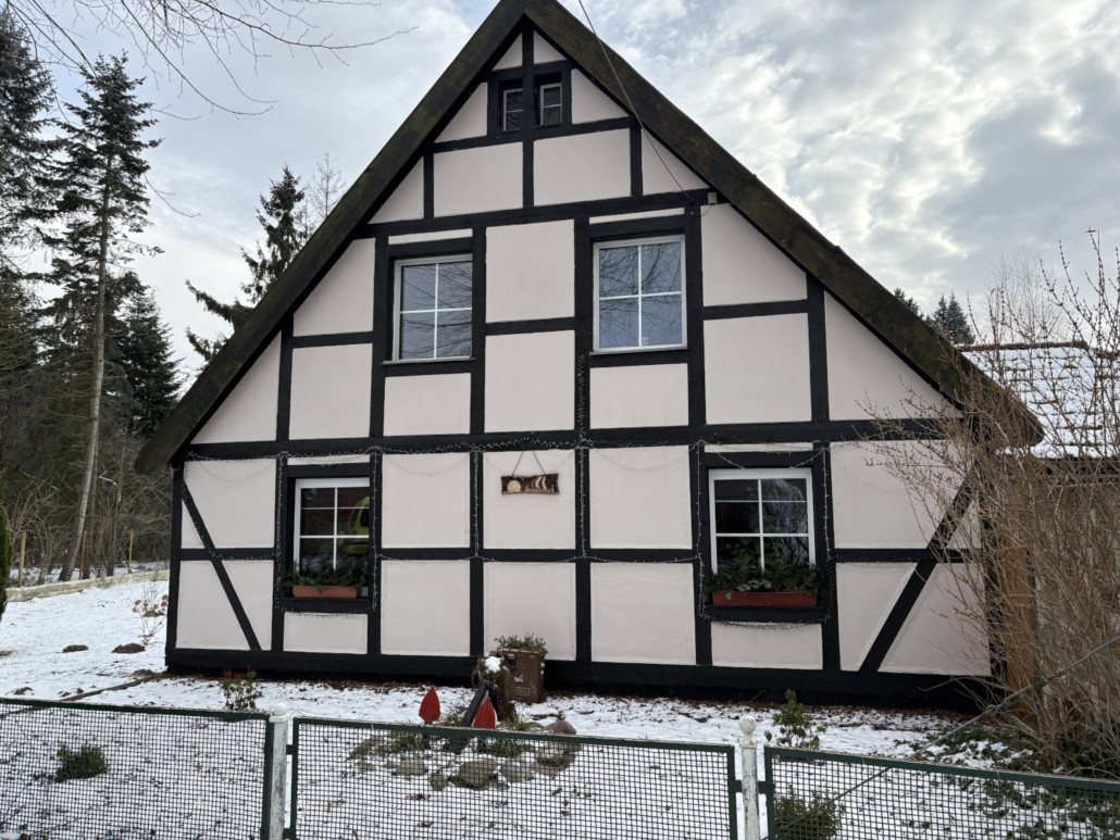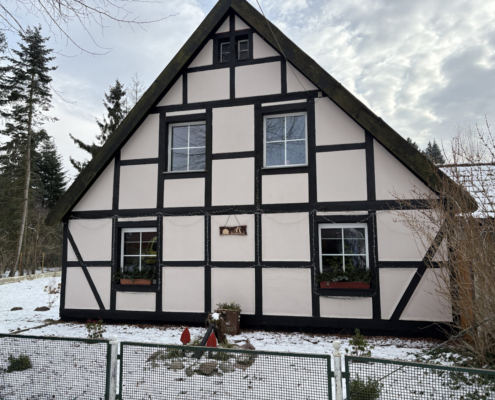 Das Haus: Das um 1948 errichtete Gebäude wurde nicht typisch für damaliger Siedlerhäuser im Fachwerkstil errichtet mit dem damals üblichen Wirtschaftsgebäudeanbau.