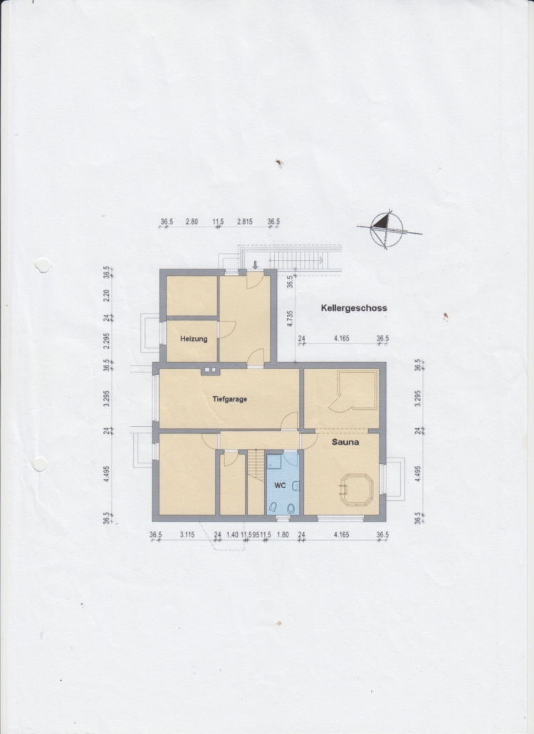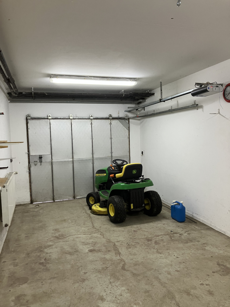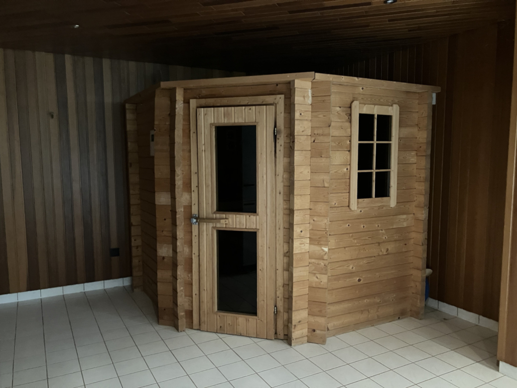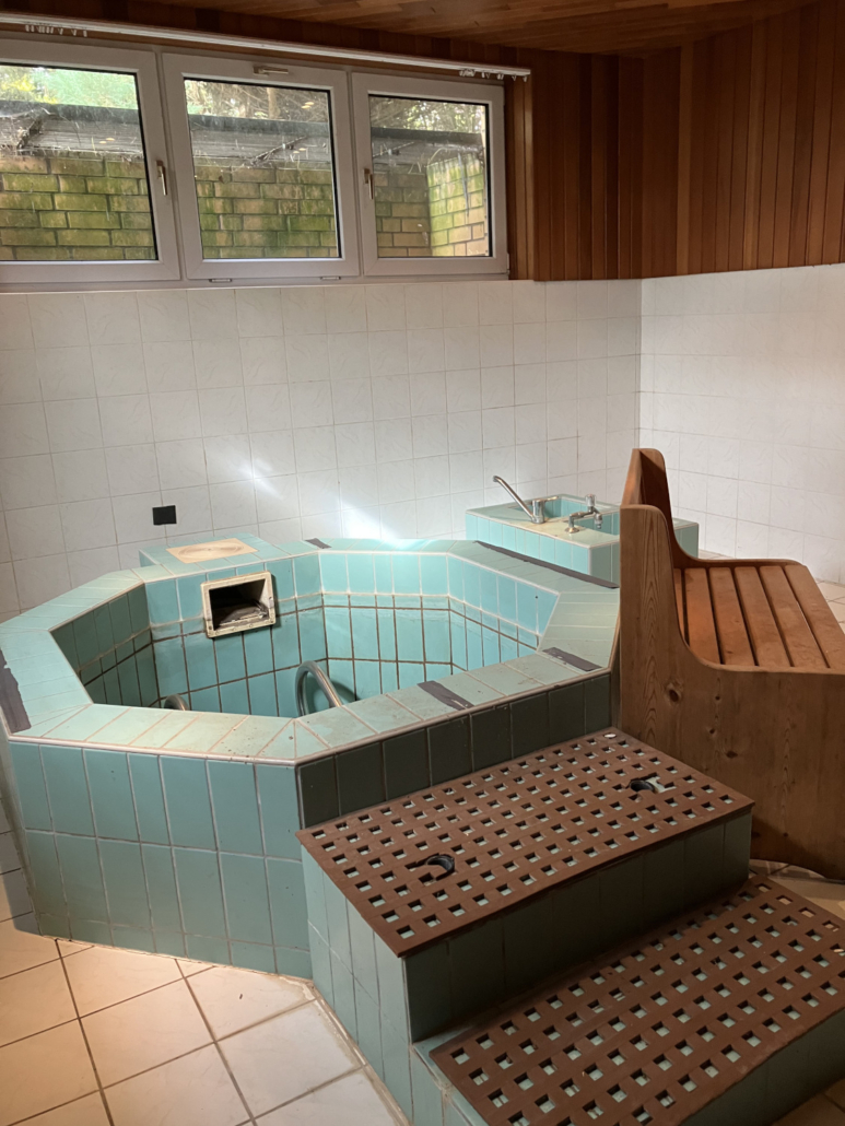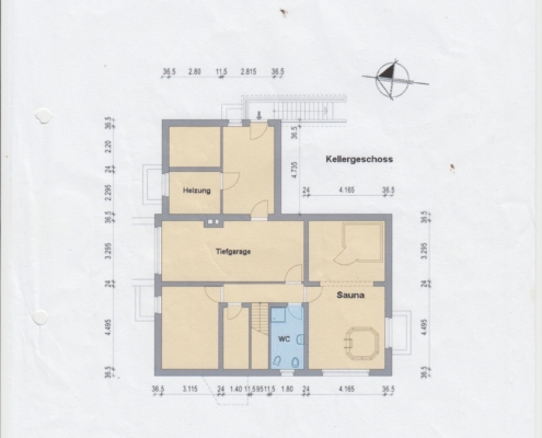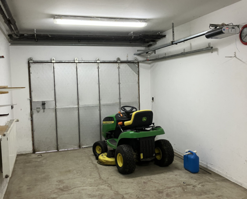 Zum Kellerbereich führt eine geflieste Treppe vom Flurbereich des Erdgeschosses, ebenfalls existiert ein Zugang vom Gartenbereich. Die vorhandene Garage hat ein elektrisches Fall Tor, weiterhin sind ein Wirtschaftsraum zum Waschen und Trocknen, ein Vorratsraum, ein üppiger Saunabereich mit Kabine für 4 Personen, Dusche, Tauchbecken, Ruhefläche mit separater Sanitäranlage, ein Hobbyraum und der Heizungsraum mit Öllager vorhanden.
