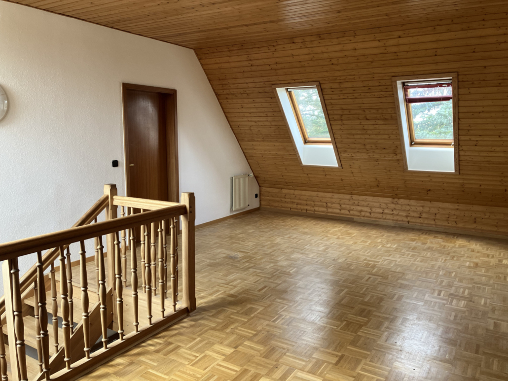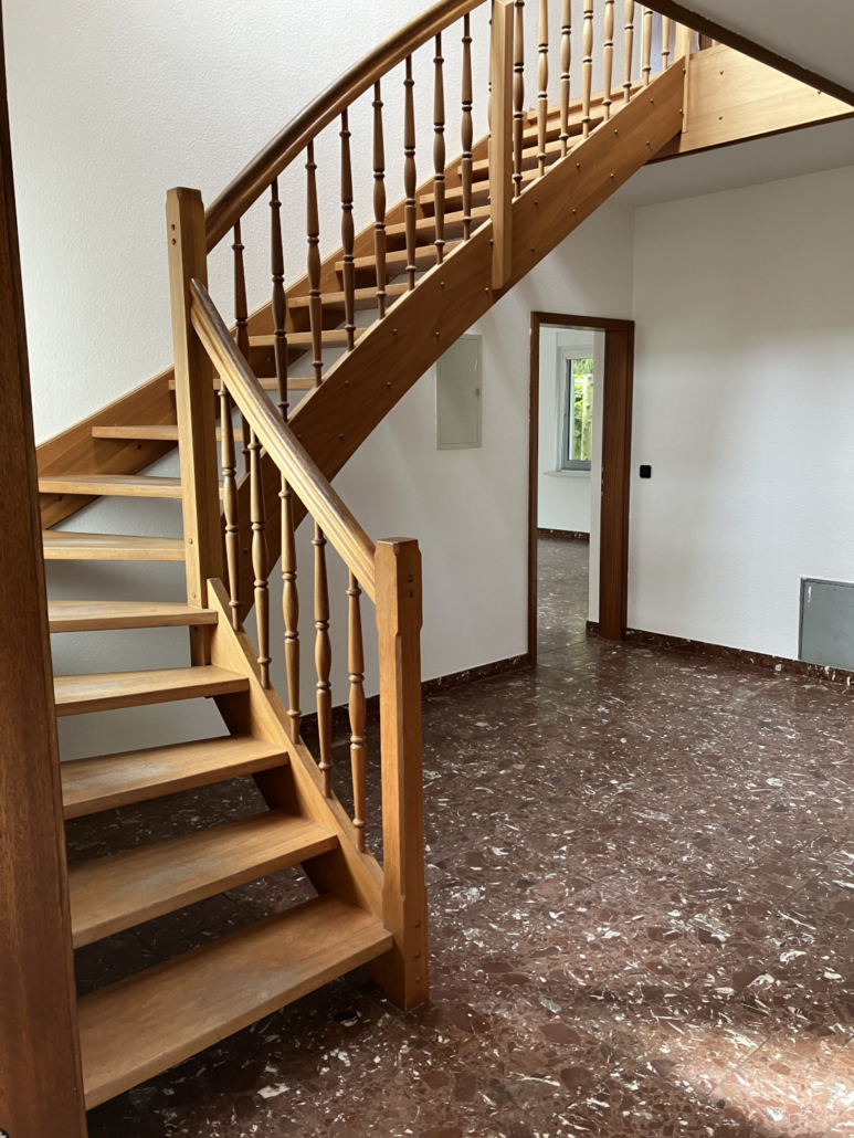 Die großzügige Raumgestaltung setzt sich im Obergeschoss des Gebäudes, erreichbar über eine Mahagoniholztreppe fort. Teilweise sind die Fußböden mir Eichenholzparkett versehen, das Bad ist bis zur Decke gefliest und mit Doppelwaschbecken, Wanne, WC, Dusche und Bidet ausgerüstet. Ein Zimmer verfügt über einen Balkonzugang.