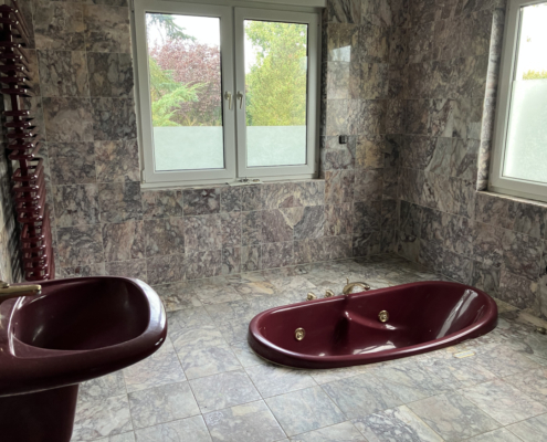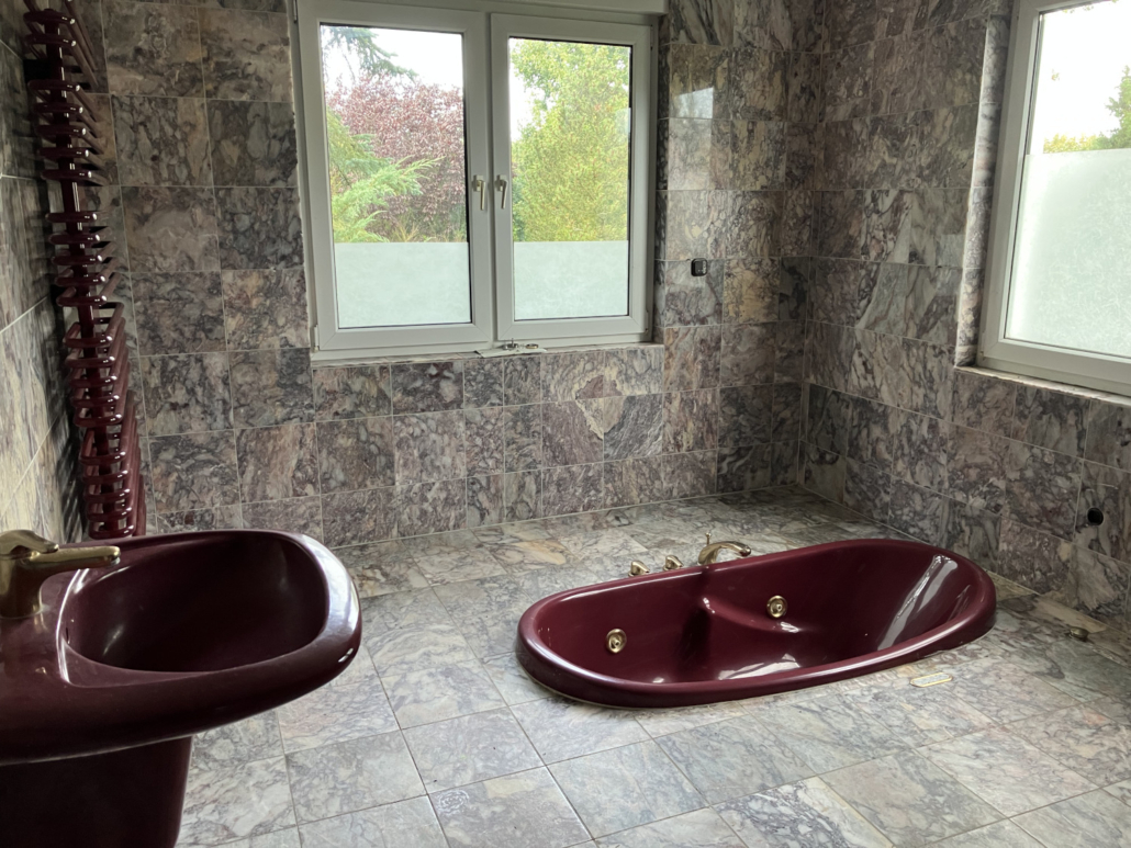 Das Haus: Das mit etwa 200 m² 1993 individuell errichtete Architektenhaus steht insgesamt mit 6, teils großzügigen Zimmern im Erd-und Obergeschoß zur Verfügung. Auffallend dominiert das geräumige Bad im Erdgeschoß mit strukturierten Marmorplatten, einer weinroten Sanitärkeramik und der im Boden eingelassenen Badewanne. Zusätzlich steht ein Gäste-WC (EG) zur Verfügung. Der Natursteinkamin im Wohnzimmer lässt wohlige Wärme in der kalten Jahreszeit erwarten, von der am Wohnzimmer angrenzenden großzügigen Terrasse mit Granitplattenbelag und Markise kann der üppige Gartenbereich überblickt werden.