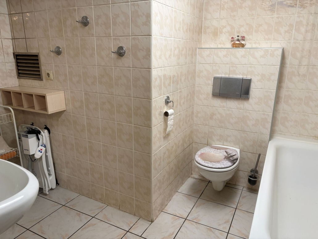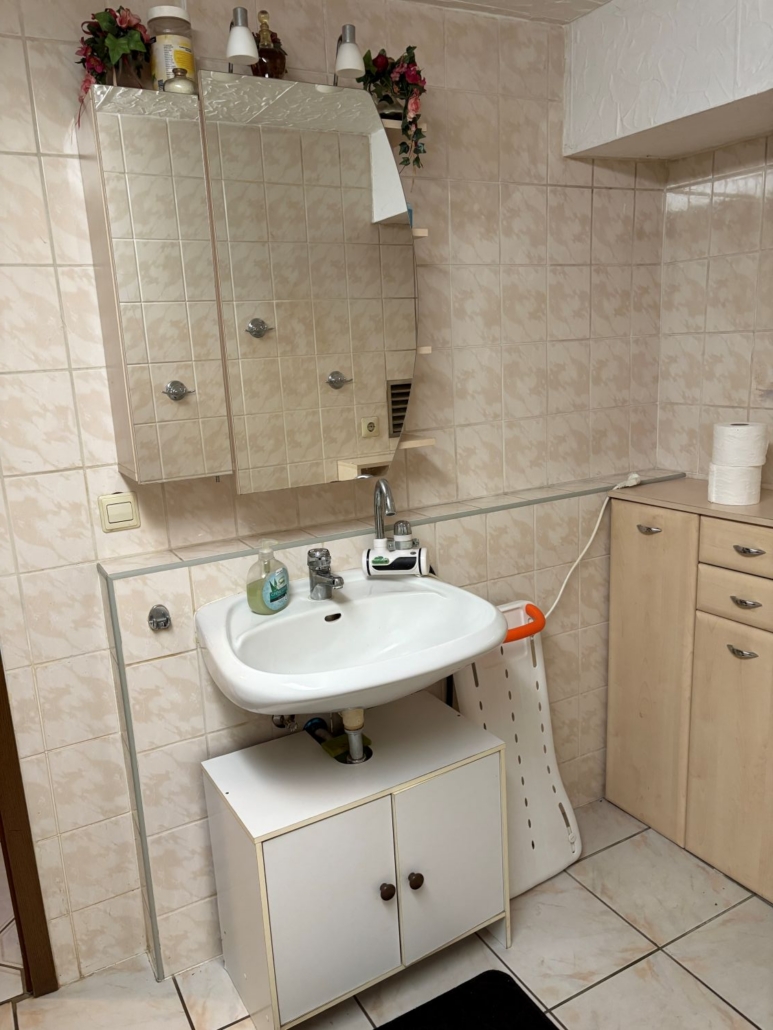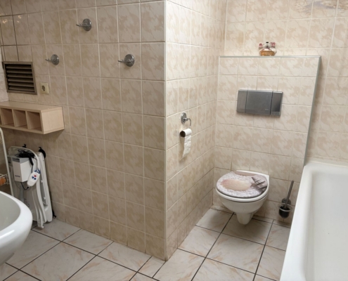 Das vorhandene Bad ist mit einer Badewanne ausgestattet, die im Durchgangsraum zur Werkstatt befindliche Dusche sollte eine Sanierung erfahren.