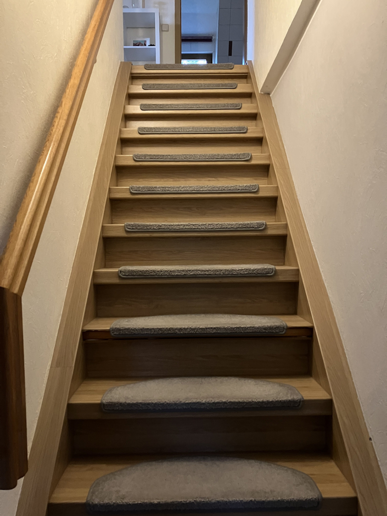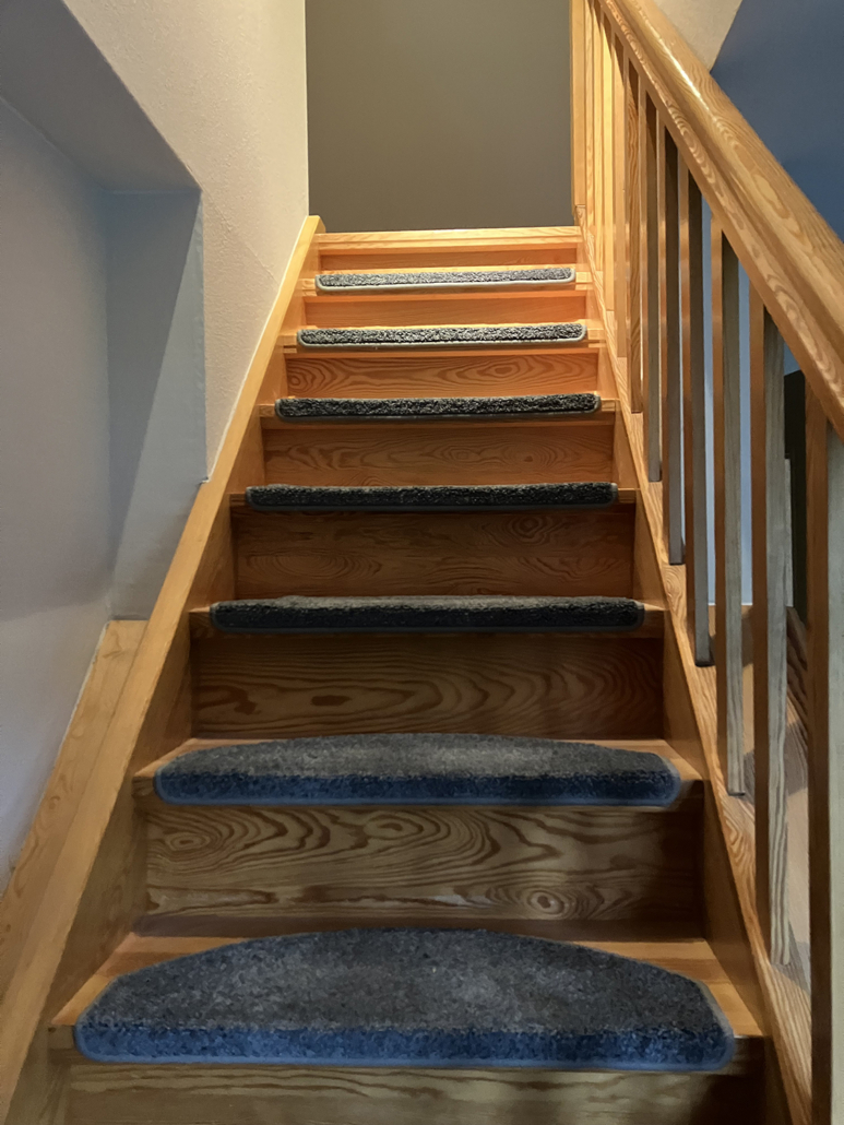 Die Zugänge zu den Geschossen sind durch moderne Holztreppen realisiert.