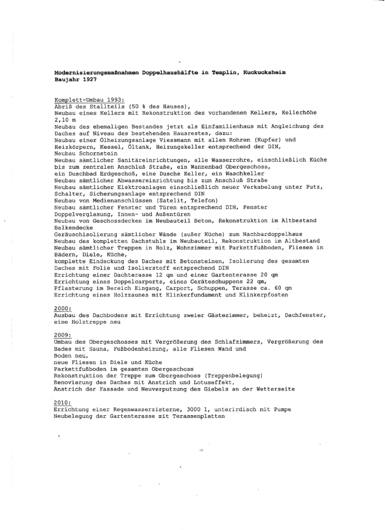 Umfassende Sanierungen sind in einer beigefügten, gesonderten Beschreibung erklärt. Erwähnt in dem Zusammenhang sollte noch die intensive Aufarbeitung der vorhandenen Holzfenster und Türen.